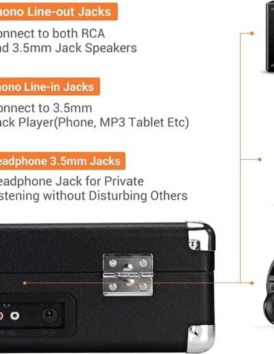 Descubre cómo puedes ampliar tus opciones de escucha conectando dispositivos externos al tocadiscos ByronStatics Maleta Vintage, desde teléfonos inteligentes hasta reproductores de música portátiles.