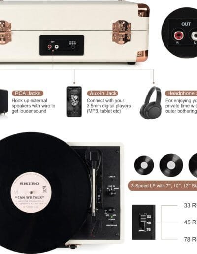 La salida RCA te permite conectar el tocadiscos de vinilo vintage portátil Retrolife a sistemas de sonido externos mediante cables, mientras que la conectividad Bluetooth te permite transmitir música de forma inalámbrica a altavoces compatibles.
