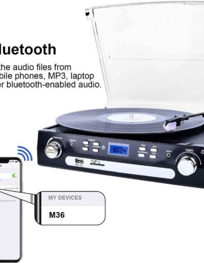 Con la función Bluetooth del Tocadiscos DIGITNOW! M36, puedes conectar tus dispositivos compatibles y disfrutar de una reproducción inalámbrica sin complicaciones. Ya sea que estés transmitiendo música desde tu smartphone, tableta u otro dispositivo Bluetooth, este tocadiscos te ofrece una conectividad confiable y conveniente.