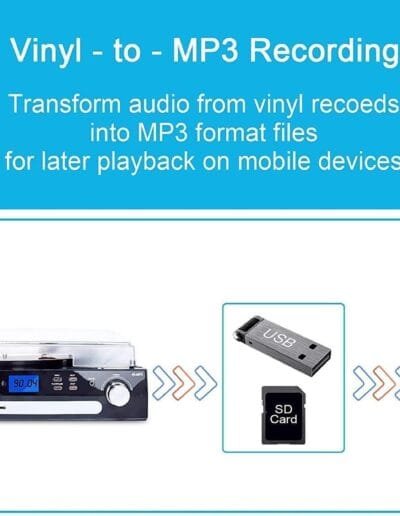 Con la función de codificación directa USB/SD, puedes convertir tus vinilos y cintas de cassette en archivos MP3 con solo presionar un botón. Disfruta de una fácil transferencia de música a tu ordenador o dispositivo digital y lleva tu colección de música contigo dondequiera que vayas.