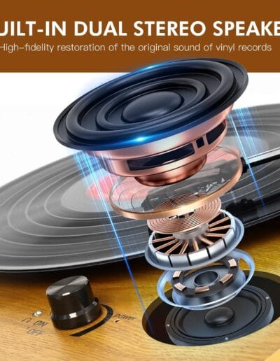 Disfruta de un sonido excepcional con los altavoces estéreo integrados de 5 W del Tocadiscos VIFLYKOO Vintage. Experimenta una reproducción fiel y vívida del sonido original de tus vinilos.