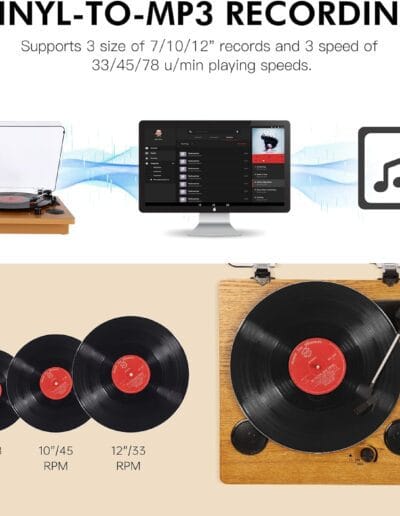 Da nueva vida a tus vinilos favoritos convirtiéndolos en archivos digitales con el Tocadiscos VIFLYKOO Vintage. Disfruta de la conveniencia de escuchar tus pistas favoritas en cualquier momento y lugar.