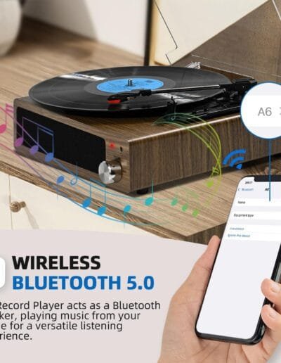 La inclusión de la función Bluetooth en el Tocadiscos FYDEE Vintage brinda una libertad sin igual a los oyentes. Ya no están limitados por cables, pueden conectar fácilmente sus dispositivos inteligentes y transmitir su música favorita de manera inalámbrica. Esta característica moderna agrega una capa adicional de conveniencia sin comprometer la calidad del sonido.