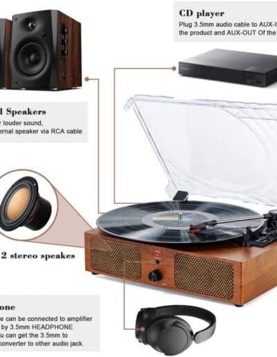 Además de los altavoces integrados, estos tocadiscos ofrecen la posibilidad de conectar altavoces externos para una experiencia auditiva aún más inmersiva. Ya sea que prefieras un sonido envolvente o una configuración personalizada, los Tocadiscos de Vinilo Vintage de Mersoco te brindan la libertad de elegir.